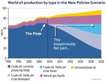 The WEO 2010 report states that “Crude oil output reaches an undulating plateau of around 68-69 mb/d by 2020, but never regains its all-time peak of 70 mb/d reached in 2006, while production of natural gas liquids (NGL) and unconventional oil grows quickly.”WEO 2010 – Executive Summary. The graph is taken from the WEO 2010 Executive Summery.
