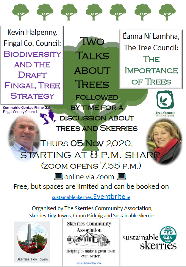 Close to 50 people zoomed in for “Two Tree Talks and a Discussion” last Thursday, organised by the Skerries Community Association, Sustainable Skerries, Skerries Tidy Towns and Crann Padraig. Most were Skerries residents, though we had visitors from as far afield as Wicklow and Malahide and Ballymun.