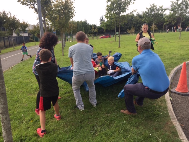 We’d assembled a fleet of wheelbarrows to wheel it away but they couldn’t keep up. Cathal had a bright idea and nipped home for a large tarpaulin which he figured could be filled and dragged by an adult at each corner. It nearly worked. The trouble was that no sooner was it filled with grass than it was even fuller of laughing children hitching a ride.