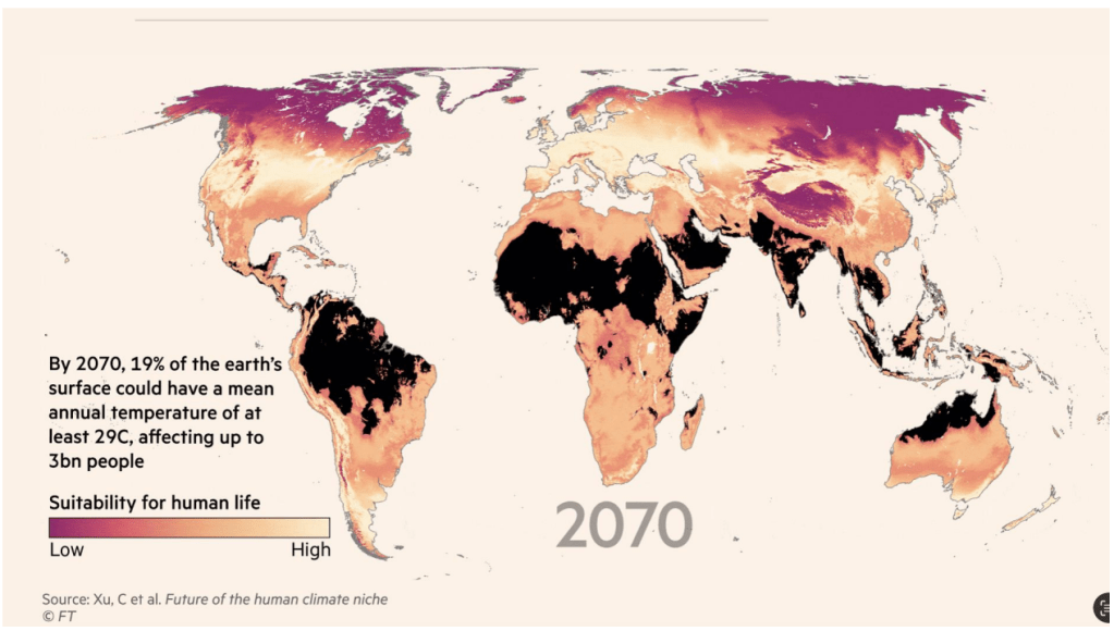 One image really hit home for me; it shows that 19% of the planet could be uninhabitable for humans by 2070, if things continue the way they are. Within my children’s lifetimes, 3 billion people could be displaced. A crisis of that size would have a huge impact worldwide.