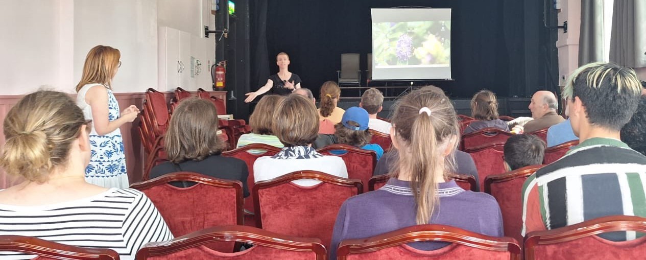 The ECO Talks session took place on Sunday 3rd September 2023 in The Little Theatre. In the nearby Old Schoolhouse, ECO Fair stalls were in full swing, facilitating a flow of people in and out of the two events, according to personal time and interest.