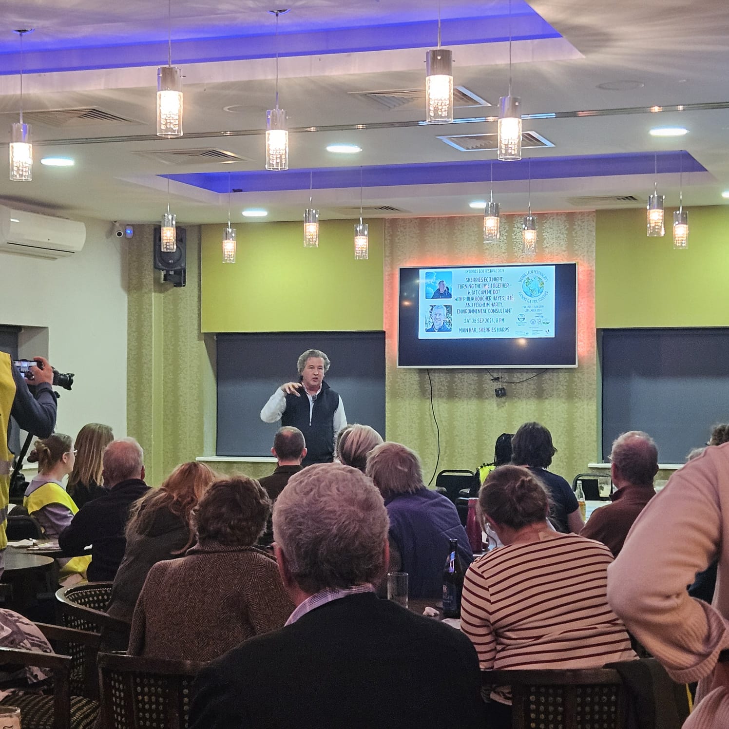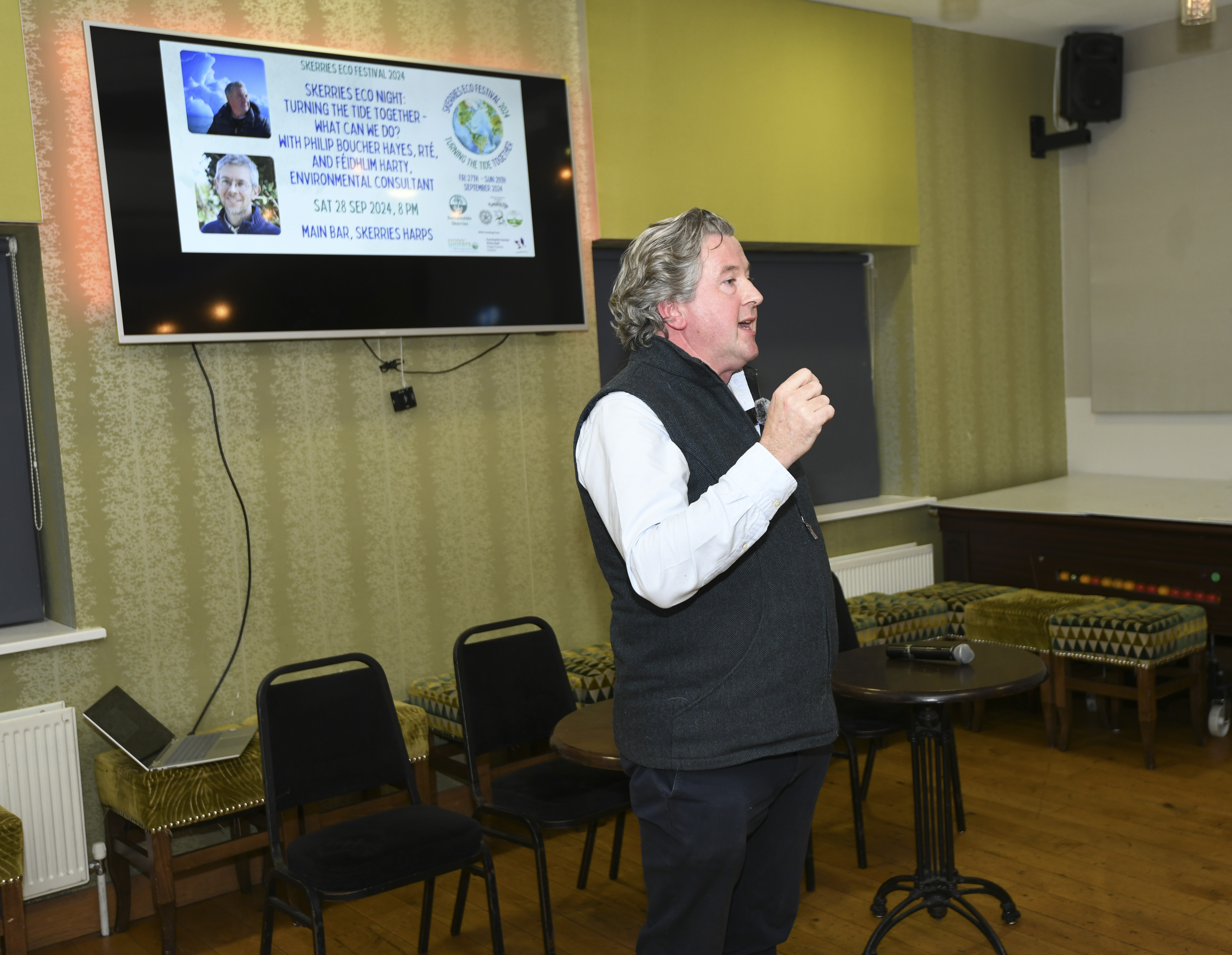 RTÉ’s Philip Boucher-Hayes joined Féidhlim Harty for a well-received night in Skerries Harps. Philip shared his experiences and insights from his recent television documentary series, “Rising Tides”… in a nutshell, there is no time for slacking, we need to act now, for instance regarding coastal erosion and coastal and inland flooding. Féidhlim was the second speaker and took us on a thought experiment… Let’s assume we’re looking back to the mid-2020s from a future where we did indeed turn the tide. What will we have done right? His answer was complex enough, but he also boiled it down to these five simple aspects: