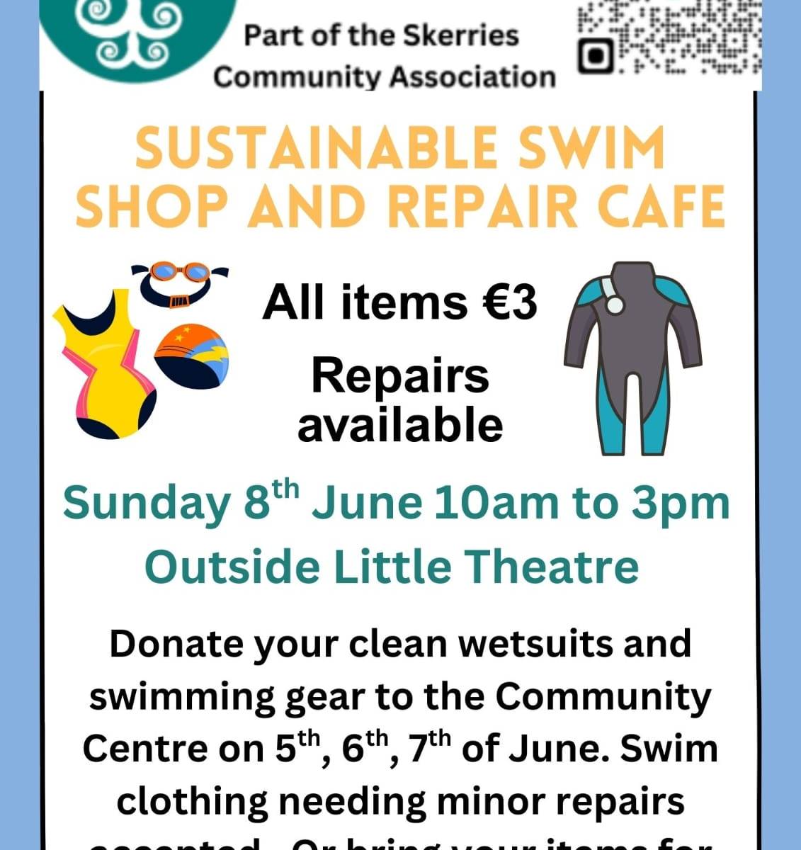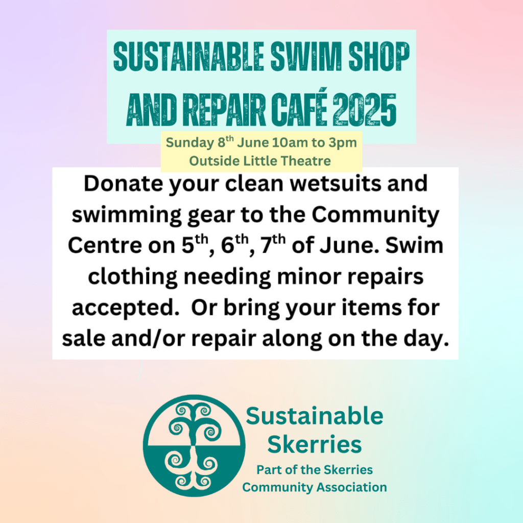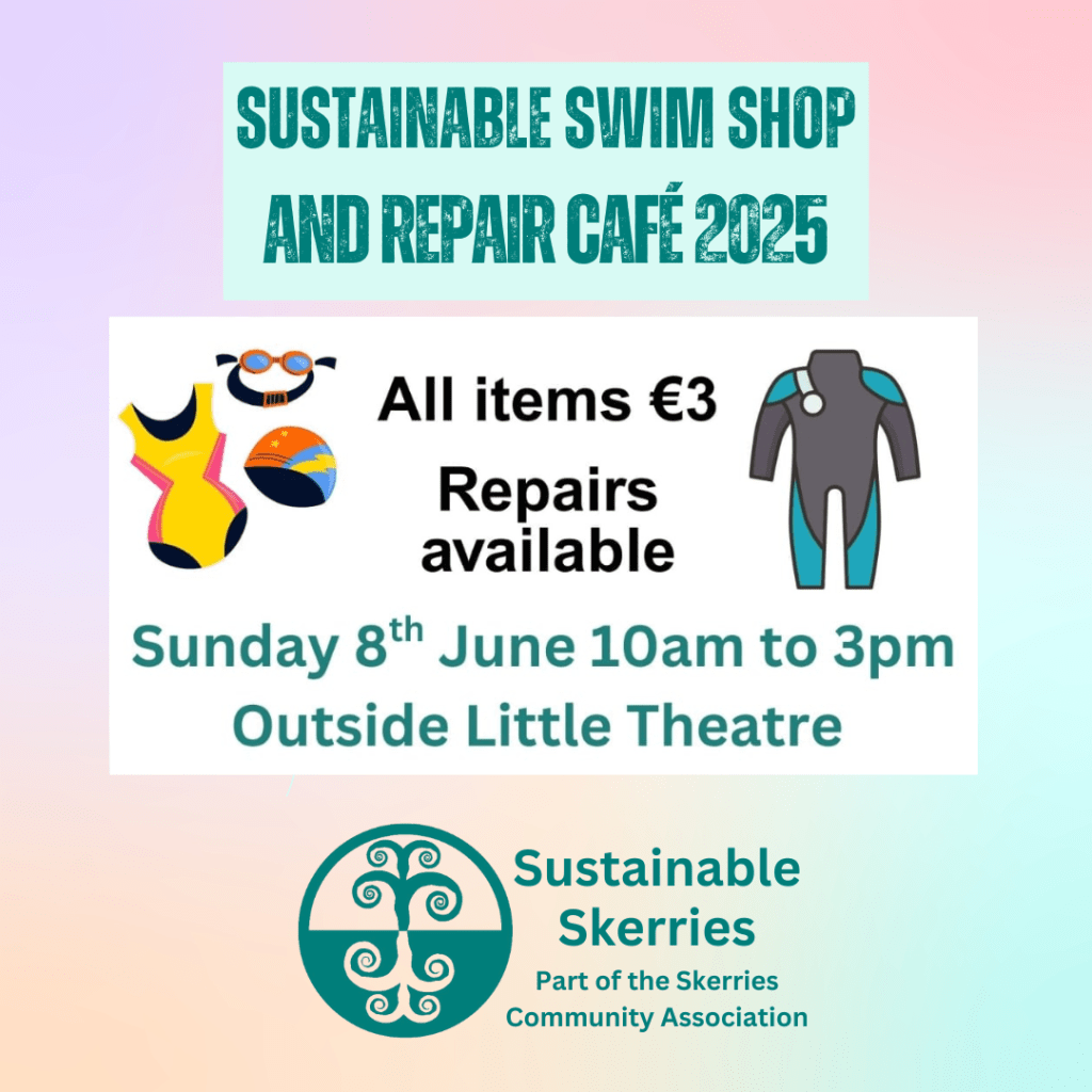 So, our Sustainable Swim Shop and Repair Cafe will take place on Sunday 8th June, 10 am to 3 pm, under the awning outside the Little Theatre. All items €3. You can donate your clean wetsuits and swimming gear to the Community Centre on 5th, 6th, or 7th June. We will accept clothing in need of minor repair. You can also donate items on the day and/or bring them for repair. Repairs will take place in Room 1. All funds raised will go to Sustainable Skerries, supporting local sustainability initiatives. Thanks in advance for your support!