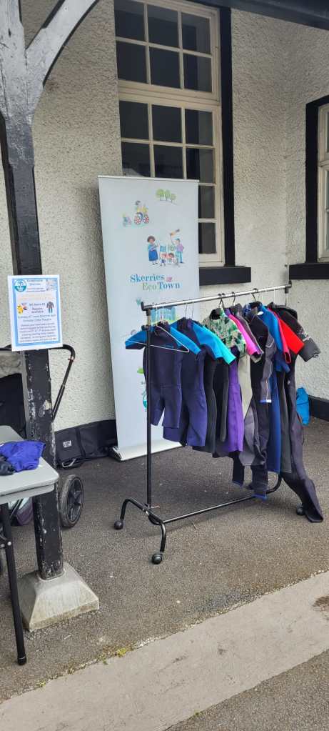 In July 2024, a lady emailed Sustainable Skerries asking if we would consider running a “wetsuit exchange.” She noted how kids’ wetsuits are often used for one summer, and then they outgrow them. She had seen our details on the sign at the then-recently launched beach toy library and decided to contact us. We thought it was a great idea, but felt it was too late to implement it for summer 2024. We mentioned it to one of the organisers of Skerries Water Safety week, who agreed and suggested we consider it for 2025, perhaps to coincide with Water Safety payment time.