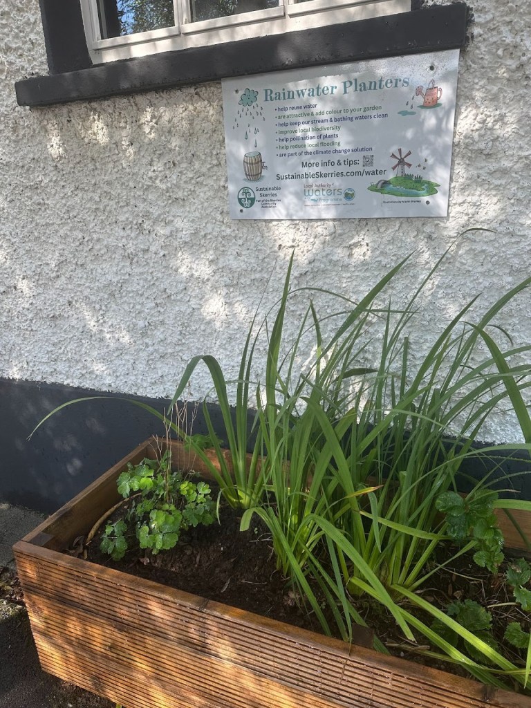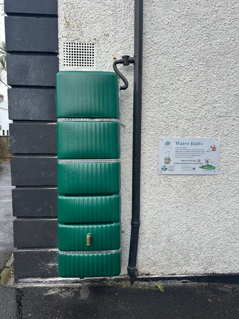 We installed a water butt and a rain planter at the Community Centre. Both these measures help slow water reaching the drains during heavy rainfall. If enough people take similar measures, we’d have fewer “No Swim” notices after storms, & cleaner water at our beaches.