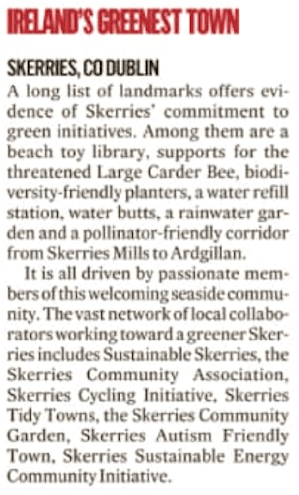 The groups include (but are not limited to): Sustainable Skerries, the Skerries Community Association, Skerries Cycling Initiative, Skerries Tidy Towns, the Skerries Community Garden, Skerries Autism Friendly Town, Skerries Sustainable Energy Community Initiative etc etc etc