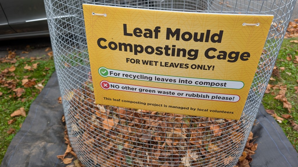 If there’s no cage nearby, collect your leaves in black plastic sacks or old compost bags, make a few holes in the sides, add a little water, and leave them in a corner for a year or two. The result: rich, weed-free leaf mould for your garden. This is also a great way to store leaves while waiting for a leaf mould cage!
