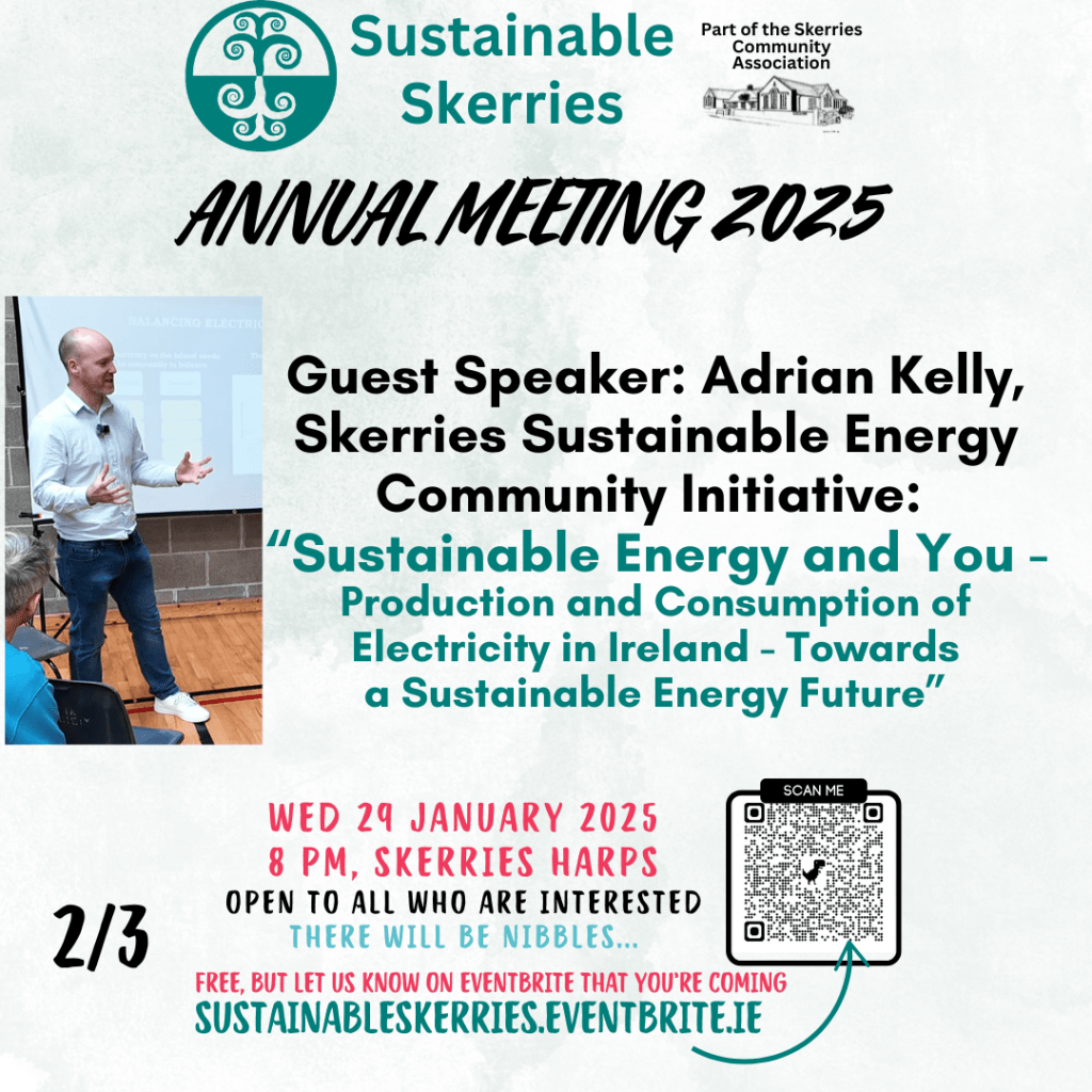 Come join us at the Sustainable Skerries Annual Meeting 2025 where we will be looking back on the previous year. Adrian Kelly of Skerries Sustainable Energy Community Initiative will give a guest talk with the title “Sustainable Energy and You: Production and Consumption of Electricity in Ireland – Towards a Sustainable Energy Future”.