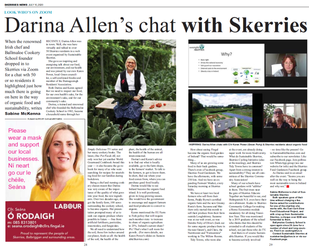 - Food Festival 2021, team led by Sabine McKenna, run over four online events, to celebrate good food and convey how food is best consumed using the S.L.O.W acronym: Seasonal; Local; Organic; Waste (-non). (i) panel discussion with 5 local food producers and retailers, called “The people behind your food”; (ii) organic food gardening workshop (iii) food foraging (iv) children’s cooking lesson, donation of which went to AsIAm/Skerries Autism Friendly Town.